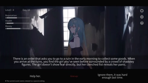 Будьте осторожны. Если показатели упадут до нуля или подскочат слишком высоко, вы можете столкнуться с катастрофической концовкой или неожиданным поворотом событий. Но не бойтесь, ведь ваши качества будут постепенно меняться со временем, чтобы подготовить вас к предстоящим испытаниям. А иногда, когда становится трудно, вы можете отступить и позволить кому-то другому справиться с ситуацией. Но остерегайтесь, поскольку за отказ от участия в мероприятии приходится платить. Ваши атрибуты пострадают, но ваш уровень повысится, что даст вам новое преимущество в игре. На 30-й день произойдет нечто важное, и вы можете дойти до конца или вернуться в 1-й день. Судьба персонажей, с которыми вы столкнетесь, находится в ваших руках, поэтому выбирайте с умом и сделайте свой след в этом незабываемом путешествии.
